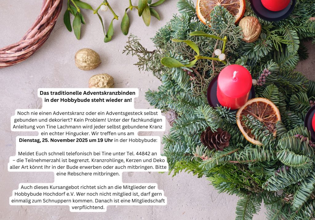 Am Dienstag, den 25. November wollen wir in der Bude wieder gemeinsam Adventskränze binden. Noch nie einen Adventskranz oder ein Adventsgesteck selbst gebunden und dekoriert? Kein Problem! Unter der fachkundigen
